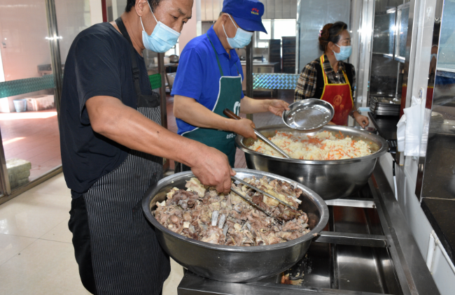 8月21日中午,伊力特公司釀酒三廠職工食堂內,一頓色澤誘人、可口怡人的牛羊肉大餐正新鮮出爐,工作人員正給每位職工溫馨服務,職工們個個戴著口罩,保持間距,錯峰就餐。