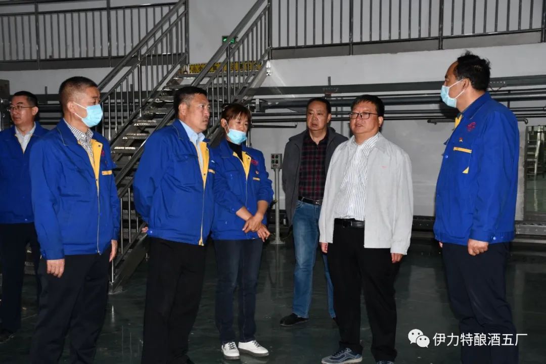 4月19日,伊力特實業股份有限公司黨委委員、副總經理劉新宇,技術中心主任海超和新源分公司領導在釀酒五廠廠長李洪超、黨支部書記宋體軍、副廠長王曉強、吳霞陪同下開展調研工作。