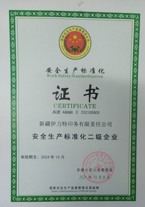 近日,伊力特印務(wù)公司收到新疆兵團(tuán)應(yīng)急管理局頒發(fā)的“安全生產(chǎn)標(biāo)準(zhǔn)化二級企業(yè)”證書,標(biāo)志著該公司已完成安全生產(chǎn)標(biāo)準(zhǔn)化二級達(dá)標(biāo)創(chuàng)建工作。